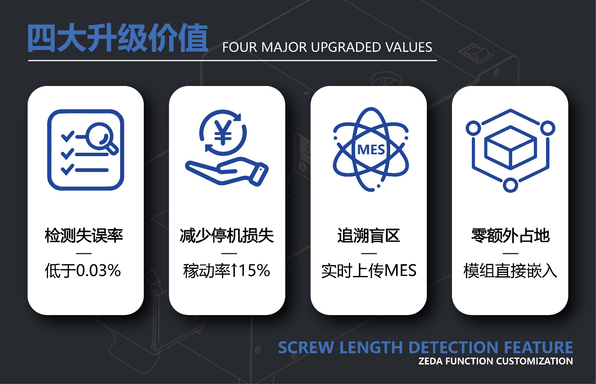 ①檢測失誤率低于0.03%:短螺絲/長螺絲>99.9%攔截,滑牙、卡機(jī)、不良螺絲統(tǒng)統(tǒng)說拜拜。
