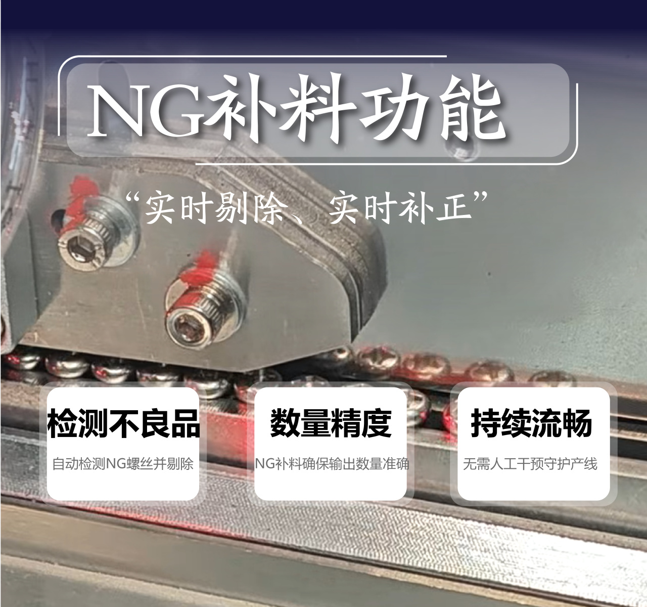 在傳統作業中,若檢測到不良螺絲(NG件),必須停機進行人工挑揀與補料,導致產線頻繁中斷。而NG補料功能徹底改變了這一局面——當設備自動識別并剔除NG螺絲后,會即刻從備用料倉補入一顆良品,確保輸出數量準確。這一「實時剔除、實時補正」的自動化循環,無需人為介入,守護了產線的持續流暢。